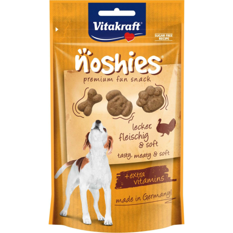 Vitakraft Noshies tápláló jutalomfalat pulykahússal, vitaminokkal a szépen fénylő egészséges szőrzetért kutyák részére. Tapintásra lágy, puha jutalomfalatkák.