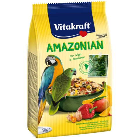 A Vitakraft Menü Amazonian egy természetes anyagokból készült, ízletes, teljes értékű eleség, mely biztosítja az eredeti élőhelyhez hasonló változatos ízeket.Felhasználási útmutató: 2-3 evőkanálnyit (kb. 25-30 g) adjunk naponta.Összetétel: gabonafélék, magvak, gyümölcs (szárított banán 3,8% , szárított földicseresznye 1,5%, mangó 1%), ásványi anyagok ( örlőkő zúzalék 3%), zöldség (szárított paprika 1%), olajok és zsírok, növényi fehérje kiv