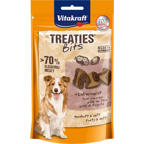 Vitakraft Treaties Bits puha jutifalatkák májjal kutyáknak. 70%-ot meghaladó hústartalommal. Természetes antioxidánsokat tartalmaz, amelyek hozzájárulnak a sejtvédelemhez. Gyengéden sütve készítik. Egészséges jutalomfalat kutyáknak. Németországban készül.