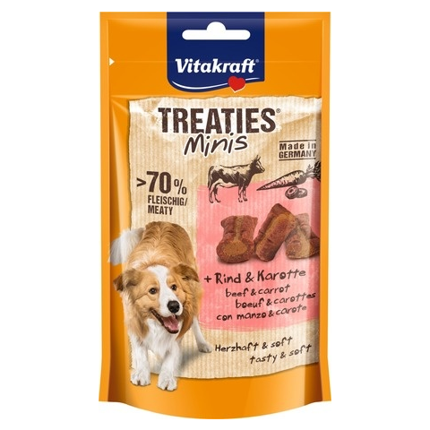 Vitakraft Treaties Minis puha, extrán húsos jutifalatkák friss marhahússal és répával kutyáknak. 70%-ot meghaladó hústartalommal. Gyengéden sütve készítik. Természetes antioxidánsokat tartalmaz, amelyek hozzájárulnak a sejtvédelemhez. Egészséges jutalomfalat kutyáknak. Németországban készül.