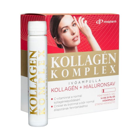Innopharm Kollagén-Komplex hidrolizált kollagént, hialuronsavat és vitaminokat tartalmazó feketeribizli ízű étrend-kiegészítő ivóampulla.