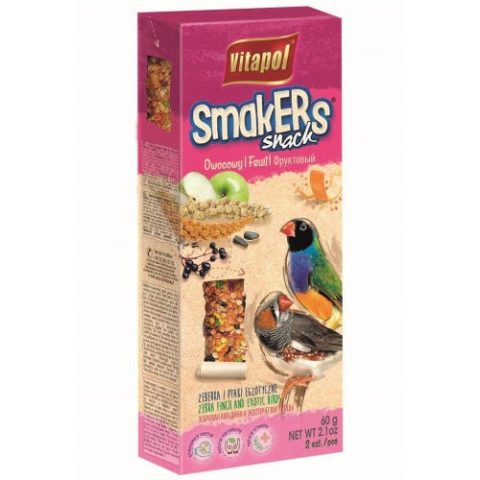 A Vitapol Smakers Dupla Rúd Gyümölcs (2 db) 60 g egy prémium minőségű, sült magrúd formájú kiegészítő eledel pintyfélék számára. A rúd természetes gyümölcsdarabokat is tartalmaz, amely ízletes alternatívát nyújt az alapeleség‐mellé, és változatosságot vis