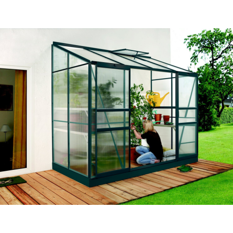 üvegház VITAVIA IDA 3300 PC 6 mm zöld színű LG567Alumínium üvegház falig, sz 255 x h 130 cm, zöld szín, 1x tetőablak, polikarbonát 6 mm, 3,32 m2. Gyártó - VITAVIA GARDEN - Nagy-Britannia Az IDA sorozat falára készült üvegházak a PREMIUM kategóriába ta