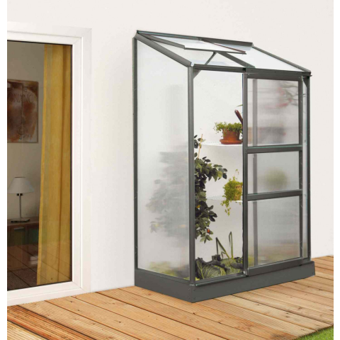 üvegház VITAVIA IDA 900 PC 4 mm fekete színű LG3545Alumínium üvegház falig, sz 131 x h 69 cm, fekete szín, 1x felülvilágító, polikarbonát 4 mm, 0,9 m2. Gyártó - VITAVIA GARDEN - Nagy-Britannia Az IDA sorozat falára készült üvegházak a PREMIUM kategóri