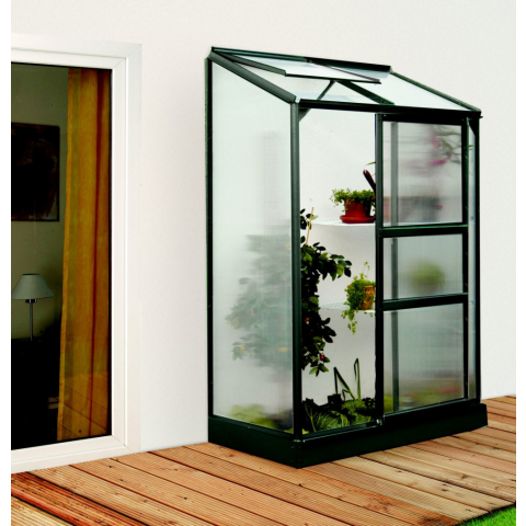 üvegház VITAVIA IDA 900 PC 6 mm zöld színű LG568Alumínium üvegház falig, sz 131 x h 69 cm, zöld szín, 1x tetőablak, polikarbonát 6 mm, 0,9 m2. Gyártó - VITAVIA GARDEN - Nagy-Britannia Az IDA sorozat falára készült üvegházak a PREMIUM kategóriába tarto