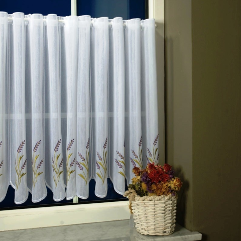 1 kép Vitrage TIHANY, levendula mintás, fehér hímzett batiszt vitrázsfüggöny 45 cm magas