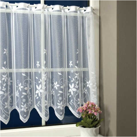 60 és 90 cm magas vitrázs függöny méteráru. Minimum rendelhető mennyiség: 5 minta. Egy minta 17 cm széles. 60 és 90 cm magas, fehér, jacquard csipke konyhai vitrázsfüggöny, cakkos aljú, indás, virágos, leveles mintával. Váltómintás. Az ablakos képen a