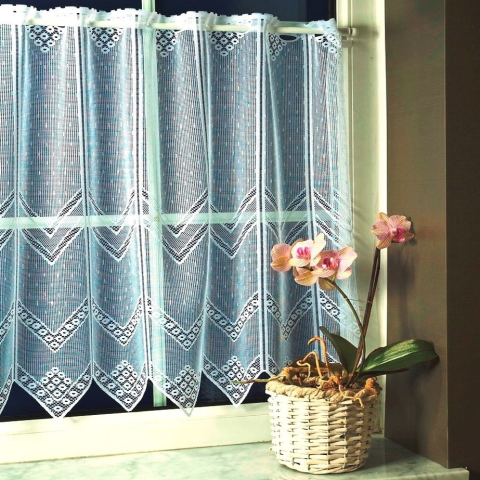 45 cm magas vitrázs függöny méteráru. Minimum rendelhető mennyiség: 9 minta. Egy minta 11,5 cm. 45 és 60 cm magas, fehér, jacquard csipke konyhai vitrázsfüggöny, cakkos aljú, gombos mintával. Az ablakos képen a 60 cm magas változat látható. Összetét