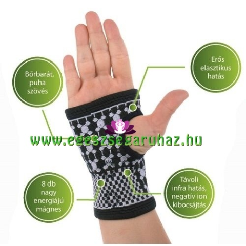 Vivafit Mágneses Csukló és Kézfejszorító turmalinnal. Intenzív mágnesterápia az anatómiailag fontos pontokon. 8 darab, egyenként 1700-1850 Gauss erősségű mágneskoronggal. A turmalin az általa kibocsájtott távoli infrasugaraknak és negatív ionoknak köszönh