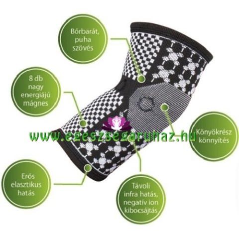 Vivafit Mágneses Könyökszorító turmalinnal. Intenzív mágnesterápia az anatómiailag fontos pontokon. 8 darab, egyenként 1700-1850 Gauss erősségű mágneskoronggal. A turmalin az általa kibocsájtott távoli infrasugaraknak és negatív ionoknak köszönhetően erős