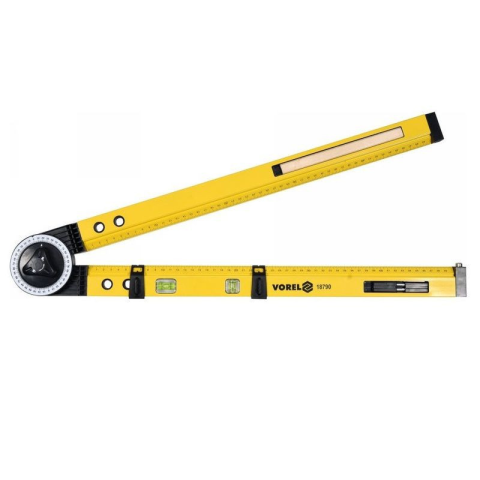 Mechanikus szögmérõ szögek mérésére és/vagy körök létrehozására. Jellemzõk: • Anyaga: alumínium • Hosszúság: 630 mm • Libellák száma: 2 • Skála: 1-500 mm (két pozicionáló csúszkával) • Asztalos ceruza • Fém tüskék a karok végén hossz 6