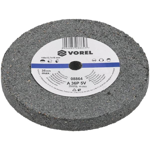 Csiszolókorong fém megmunkálásához - 150 mm átmérő, 16 mm vastagság, 5350 ford/perc maximális sebesség, 12,7 mm szerelőnyílás A kiváló VOREL Asztali csiszológép korong, 150×12×15 mm, durva alapvető tulajdonságai Az erős VOREL csiszoló korong kiváló segítőd lesz az anyagok köszörülésénél és megmunkálásánál Durva felülete lehe