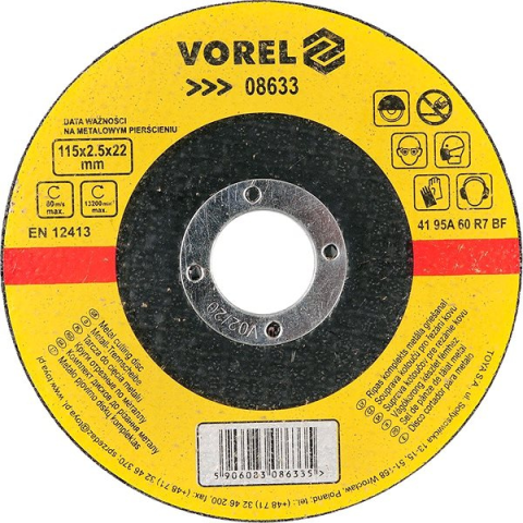 Vágótárcsa - átmérője 115 mm, vastagsága 2,5 mm, fém vágásához alkalmas A minőségi Vorel fémvágó korong 115 x 22 x 2,5 mm alapvető tulajdonságai Az időtálló VOREL vágókorong hosszú élettartamáról híres Vastagság: 2,5 mm Átmérője 115 mm A vágótárcsa helyes rögzítése egysze