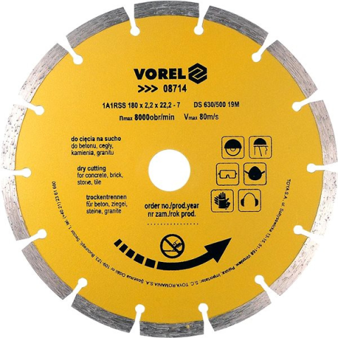Vágótárcsa - átmérője 180 mm, vastagsága 2,2 mm, fal, beton, tégla, csempe, kő, gránit vágásához alkalmas Eme VOREL - gyémánt, 180 x 22,2 x 2,2mm, szegmentált főbb előnyei Az erős VOREL vágókorong magas kopásállóságot biztosít A maximális vágási pontosság és sebesség érdekében vékony gyémántréteggel rende