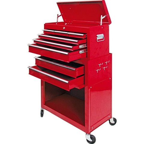 Szerszámos kocsi - anyaga: acél, mérete: 62 cm×107 cm×33 cm (sz×ma×mé), piros színű, vontatható és asztali Ez a fém doboz méretei 107 × 62 × 33 cm, súlya 29,5 kg részén nyolc fiókok és további tárhelyet a szerszámok.Talán minden férfi - legyen akár otthoni ezermester vagy profi szakem