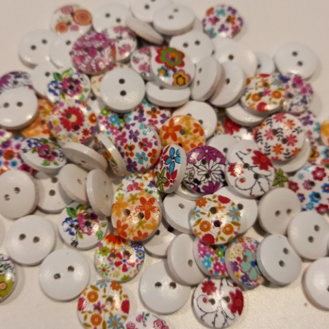 Vidám, virág mintás fa gombok. 15mm átmérőjű, vegyes csomagban.