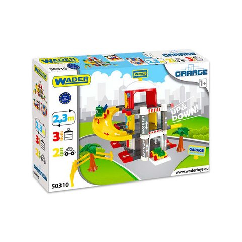 A Wader három emeletes garázsa, 2,3 m hosszúságú pályával rendelkezik, mely az emeletekre is felkalauzolja a kis sofőrt. Ám ha a gyerkőc szeretné kisautóját egyszerűbben feljuttatni a legfelső emeletre, a lift pillanatok alatt felviszi! A készletben 2 db kisautó is található. A garázs elemei könnyedén összeilleszthetők, így akár a gyerkőcök is felállíthatják a pályát. A gyerekek parkolhatnak az autókkal, versenyezhetnek, lecsúszhatnak a kanyargós utakon, és f