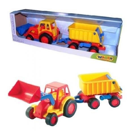 Két fémtengelyes kis traktor mozgatható tolólapát résszel, szintén két fémtengelyes billenthető utánfutóval, gumibevonatú kerekekkel. A csomagolás mérete: 470×125×135 mm. 2 éves kortól ajánlott! Színbeli eltérés lehetséges. Az ár 1 db-ra vonatkozik. WADER minőség!