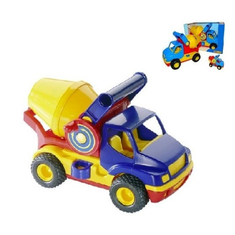 Két fémtengelyes betonkeverő forgatható betonkeverő résszel, strapabíró műanyagból, valódi gumi- kerekekkel. A billenőrész egy stift kihúzásával dönthető, illetve visszaállítás után rögzíthető. A csomagolás mérete: 295×165×200 mm. 2 éves kortól ajánlott! Színbeli eltérés lehetséges. Az ár 1 db-ra vonatkozik. WADER minőség!