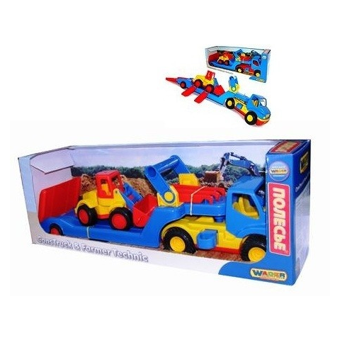 Három fémtengelyes autószállító strapabíró műanyagból, valódi gumikerekekkel. A tréler egy stift kihúzásával oldható, illetve visszacsatolható. A képen látható két fémtengelyes Basic markoló tartozék. A csomagolás mérete: 570× 165×200 mm. 2 éves kortól ajánlott! Az ár 1 db-ra vonatkozik. WADER minőség!