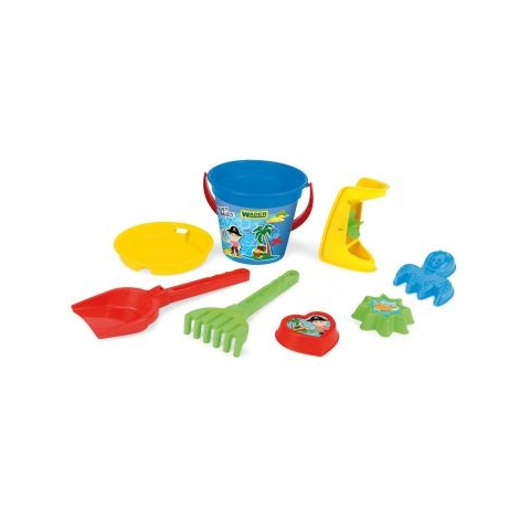 Wader: 8 részes homokozószett. Tartalma: 1 db vödör, 1 db lapát, 1 db gereblye, 1 db szita, 3 db homokozóforma, 1 db malom. Csomagolás mérete: 23,5 x 34,5 x 21,5 cm