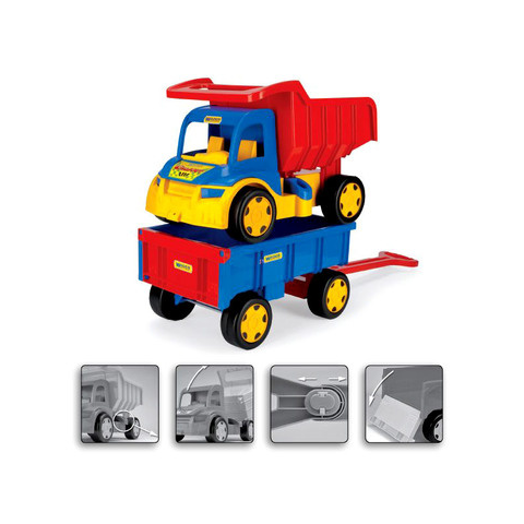 Nagy méretű, strapabíró műanyagból készült Wader dömper, dönthető platóval. A dömper teherbírása nagyon erős, akár 150 kg-ot is elbír. A készletben megtalálható még egy Wader kézikocsi is, amiben 60 kg játékot is könnyedén el tudsz húzni. A dömper hátulja billenthető, az utánfutó hátfala lenyitható. Dömper méretek: 55 x 37 x 32 cm, kézikocsi méretek: 49 x 25 x 31 cm. Csomagolási méretek: 55 x 32 x 59 cm.