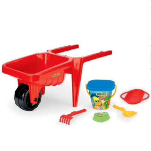 Jellemzők: Nagy méretű talicska Maximum 100kg terhelhetőség Piros színben Emelhető hengerrel 3 db Homokozó kiegészítővel Homokozó vödörrel Szabadon forgó kerék Mérete: 77×32×34 cm Anyaga: műanyag Kor: 1+