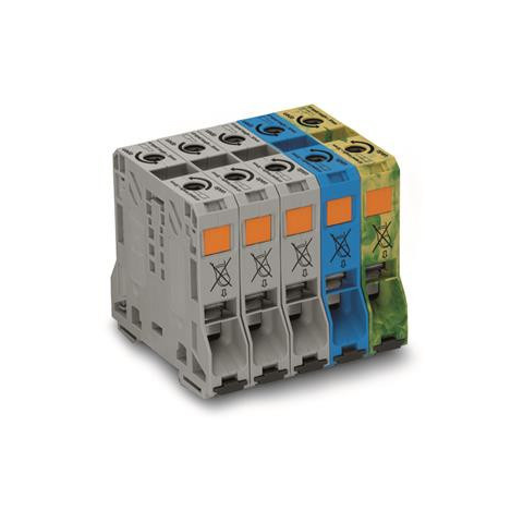 WAGO 285-159 50mm2 Háromfázisú nagyáramú sorkapocs készlet DIN 35 x 15 sínre, POWER CAGE CLAMP technológiával Tartalma: 3db 285-155 szürke + 1db 285-154 kék + 1db 285-157 zöld-sárga