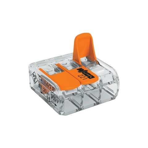 Szín - Átlátszó Kapcsok száma - 3 Névleges keresztmetszet 0,14...4 mm2 Névleges feszültség - 450 V Névleges áram - 32 A Alkalmas masszív vezetékhez - Igen Rugalmas vezetékhez használható - Igen Többdrótos vezetékekhez használható - Igen