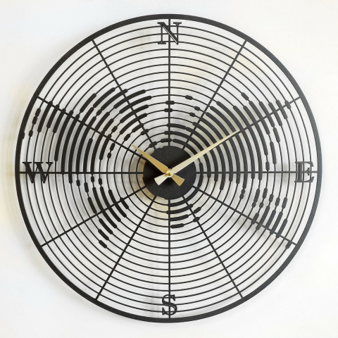 Az eredeti falióra iránytűrózsa motívummal egyedi vizuális élményt nyújt bármely modern belső térben. A koncentrikus körök, az észak-déli tengely és a ritmikus minta pontos geometriája nemcsak dekoratív elemet, hanem egy teljesen funkcionális órát is létrehoz. Az aranyszínű mutatóknak köszönhetően az időjelzések jól láthatóak és egyértelműek.