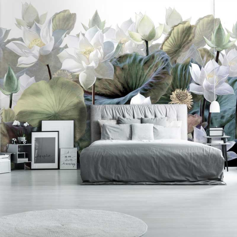 Óriás fehér tavirózsa mintás vlies fotótapéta A kép 460 cm széles és 300 cm magas - 5 db 92x300 cm-es részből áll. A csomag tartalmazza a tapétaragasztót és a felrakási útmutatót. A termék a megrendelést követően kerül legyártásra, ezért a szállítási idő: