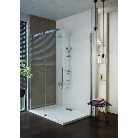 Termékjellemzők: - 8 mm víztiszta, edzett biztonsági üveg - vízlepergető NANO bevonat a könnyebb tisztíthatóság érdekében - úszó kivitel - görgők csak a felső profilban - alacsony zajszintű rozsdamentes acél dupla görgők, kisiklás elleni védelemmel - rejtett alsó vezetőgörgő - kiváló minőségű krómozott alumínium profilok - jobb és baloldali szerelhetőség - állítható méret - fém fogantyúk_x000D_