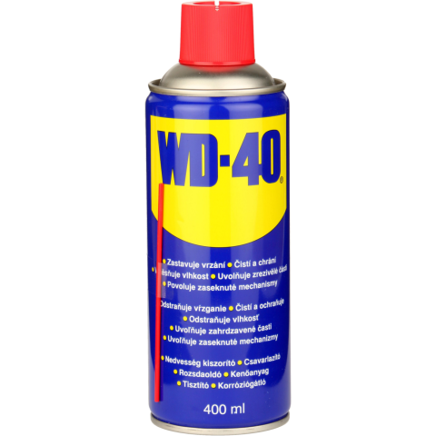 WD-40 - Csavarlazító, rozsdaoldó-korróziógátló, kontaktjavító, illetve tisztító-kenő-védő, nedvesség-kiszorító hatású aeroszol Kiszorítja a nedvességet, párát, javít az elektromos érintkezések minőségén, elősegíti a nedves motorok beindítását. Kenőhatás