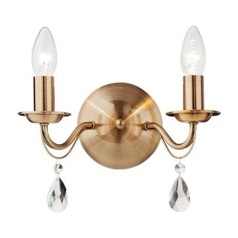 A Fabiola lámpatest fémrétegű, antik sárgaréz és átlátszó üveg díszítéssel. Ez a lámpatest két E14 aljzattal felszerelhető, maximális teljesítményük 2 x 28W. A forrásokat külön kell megvásárolni, és A ++, A +, A, B, C, D és E izzókkal is felszerelhet