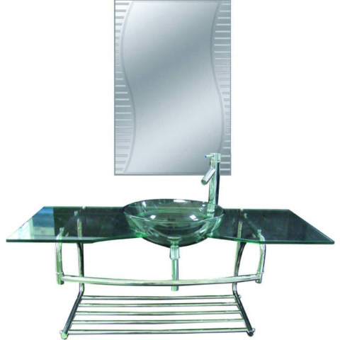 A fürdőszoba bútor szetthez tartozik: egy tükör, polc, mosdó Ez a szett elegánsan ötvözi a modern fürdőszobát. A tükör a fürdőszobabútor és a mosdó felett helyezkedik el a falon felfüggesztve. A mosdó átlátszó üvegből készült. A bútor alján egy polc
