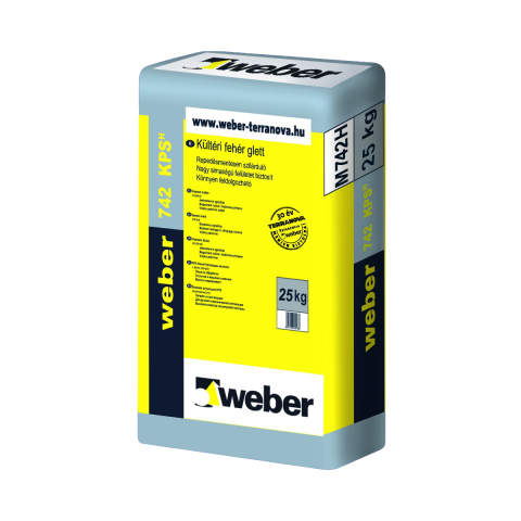 Weber 742 KPS (H) glett  - 25 kg  - fehér  - cementkötésű szárazhabarcs  - elsősorban kültérben, glettelt simaságú felület készítéséhez  - simított alapvakolaton (nem gipszes alapra)  - festés előtt a vakolat egyenetlenségeinek megszüntetésére  - kisebb lyukak, repedések, fugák, homlokzati díszítések javítására  - külső és belső felületekre  - felhasználásra kész  - por alakú  - repedésmentesen szilárdul  - jól csiszolható  - több rétegben felhordhat