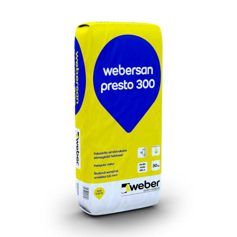 A Weber San presto 300 (SPR300) falszárító simítóvakolat nedves, sóterhelt falazatok páraáteresztő kiegyenlítésére szolgál. Belső és külső felületen, régi és új épületekben egyaránt alkalmazható, mész–cement bázisú, könnyű adalékos habarcs. A 30 kg-os zsá