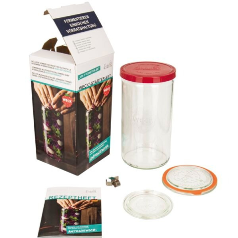 Készíts otthon hagyományos, probiotikumokban és vitaminokban gazdag fermentált finomságokat savanyú káposztát, kimchit, savanyított uborkát és zöldségmixeket könnyedén. A praktikus WECK fermentáló szett 1,59l űrtartalommal biztonságos és kényelmes fermentálást tesz lehetővé, köszönhetően a kiváló minőségű üvegnek, az üvegsúlynak és a szilikon tömítéseknek.
