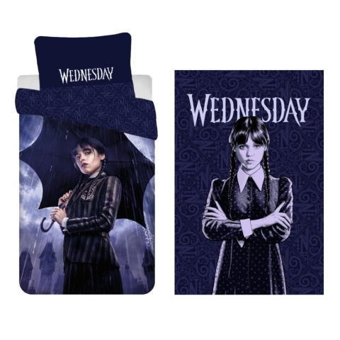 Wednesday mintás felnőtt méretű ágyneműhuzat garnitúra: Két részes, pamut ágynemű huzat szett, igazi rajongóknak! A csomag tartalma: 1 darab párnahuzat: 70x90 cm 1 darab takaróhuzat: 140x200 cm Anyaga: 100% pamut Cipzáros, 40 fokon mosható Wednesday