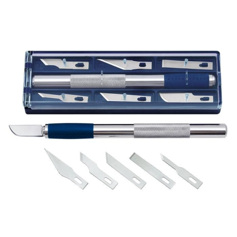 Hobbikés, 15 cm, 6 különböző pótkésssel, WEDO ideális finom papír, karton és fólia vágásához univerzális kés hat különböző pengealakkal, ideális finom barkács és papír, karton és fólia vágási feladatokhoz anyaga: alumínium, gumizott fogófelülettel a má