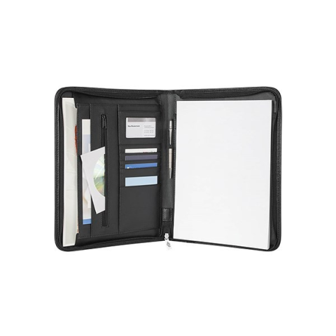 Konferencia mappa WEDO Elegance A/4 zip-záras jegyzettel zsebekkel tolltartóval A/4-es bőrhatású konferencia mappa, jegyzettömbbel, A/4-es és A/5-ös zsebbel. Zip-záras záródással. Átlátszó zseb a névjegykártyának, gumis írószertartóval. Mérete: 33x2,5
