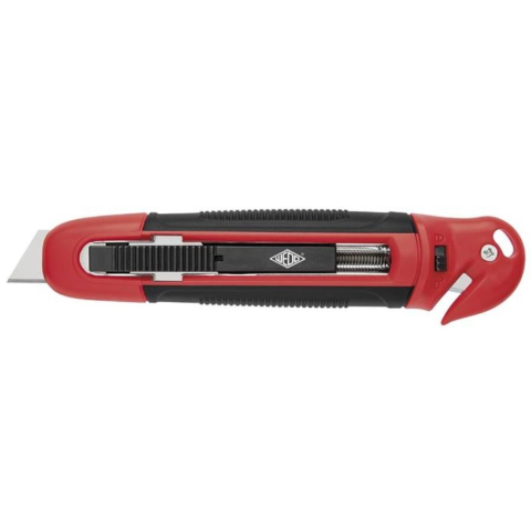 Univerzális kés, 18 mm, fóliavágóval, WEDO, Safety piros/fekete (UW038) beépített fóliavágóval penge szélessége: 18 mm automatikusan visszahúzható, trapéz kialakítású, rugós szénacél penge ABS műanyag ház gumírozott fogórész balkezesek által is használ
