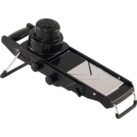 Zöldségszeletelő all-in-one. A forgatható kerék segítségével könnyen beállítható a fej szélessége. Zöldségtárolót is tartalmaz a biztonságos használat és a kezek védelme érdekében. A gumilábak a stabilitást biztosítják. A nagyon éles kések minőségi rozsdamentes acélból készültek.