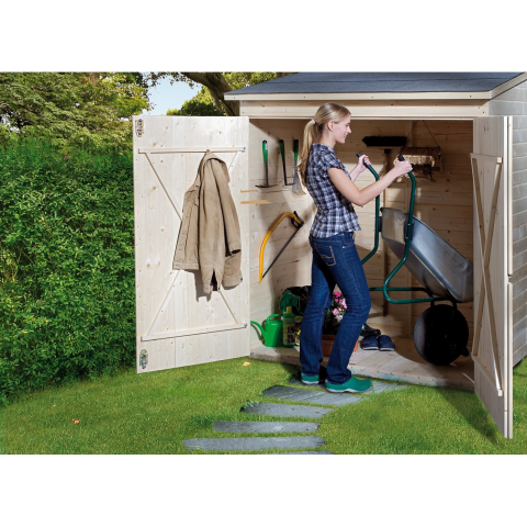 A tetszés szerint felszerelhető tető és a kezeletlen faelemek a meglévő tárolóhely egyedi kialakítását teszik lehetővé. Elemekből felépülő kerti- és teraszszekrény, kezeletlen, 14 mm-es falvastagság, 14 mm-es tömör fa lapos tetővel, 19 mm-es tömör fa padló Tetőkinyúlások: mindegyik oldalon kb. 8 cm, elöl hátul 10 cm Méretek: teljes magasság: 195 cm, hátfal: 176 cm Ajtó (ajtónyílás belmérete): egyszárnyú ajtó: 75 cm x 163 cm Tetőfedés: bitumenes tetőbu