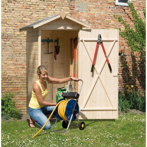 A kerti- és teraszszekrények praktikus helyvarázslók, és minden kihasználatlan sarokba illenek. Egy- és kétajtós változatok is kaphatók. Elemekből felépülő kerti- és teraszszekrény, kezeletlen, 14 mm-es falvastagság, 14 mm-es tömör fa nyeregtetővel, 19 mm-es tömör fa padlóval Tetőkinyúlások: mindegyik oldalon kb. 12 cm, hátul 10 cm Méretek: 200 cm-es tetőgerinc-magasság, 180 cm-es oldalfal (az alap felső szegélyétől mérve) Ajtó (ajtónyílás belmérete): egy