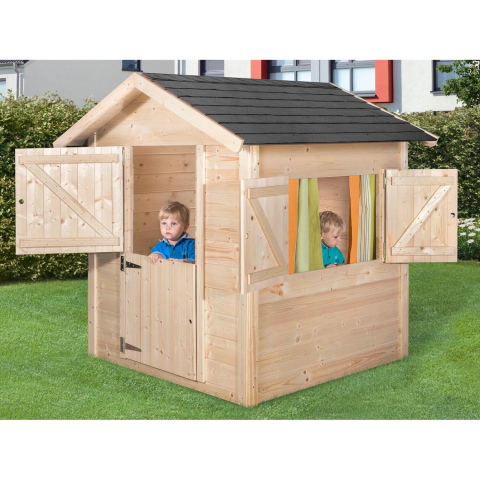 A Weka Tabaluga natúr gyermek sárkánybarlang játszóházzal gyermekeinek saját királyságuk lesz a kertben való játékhoz - akár egyedül, akár barátokkal. A két részre osztott ajtó és az ablakok spalettái összecsukhatók, ami még valósághűbbé teszi a gyermekek valódi otthonának benyomását. A ház 21 mm vastag, erős gerendákból áll a biztonságos játék érdekében. A natúr fa sok teret kínál az egyedi kialakításhoz, például festékkel vagy matricákkal (kü