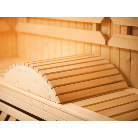 A természetes, speciális szaunafából készült vénatámasz pihentető fekvést tesz lehetővé és alakjának köszönhetően serkenti a vérkeringést.