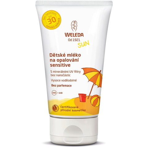Naptej - 30 védőfaktoros, testre A WELEDA SPF 30 Sensitive vízálló gyermek napozótej ásványi UV-szűrőkkel, nanorészecskék nélkül védi a bőrt. Az illatanyagmentes összetétel kíméletesen ápolja az érzékeny gyermekbőrt. Az ásványi UV-sz
