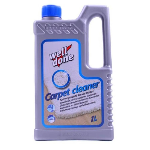 Well Done szőnyegtisztító 1L Hivatalos magyarországi forgalmazótól. Leírás: Speciális Well Done tisztítószer kézi és gépi tisztításhoz. Kiválóan alkalmas szőnyegek, kárpitok, valamint gyapjú és műszálas szőnyegek tisztítására, folttisztítására. Használat: Kézi tisztításnál adjon 0,5 dl szőnyegtisztítót 3 liter (kéz meleg) vízhez, habosítsa fel, majd dörzsölje a tisztítandó felületre. Ha megszáradt pórszívózza ki. Gépi tisztításnál adjon
