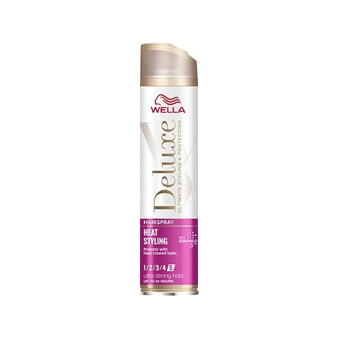 Hajlakk - luxus kozmetikum, dúsító, hajvédő és fixáló hatás, minden hajtípusra, kócolódás elleni, külső hatások elleni és töredezés elleni védelem, extra erős fixálás, 250 ml-es kiszerelésben A Wella Deluxe Heat Styling egy erős fixálással rendelkező hajlakk, amely ideális a haj hővel történő formázásához. Hosszú időre megbízhatóan rögzíti frizurát, és maximális kontrollt biztosít minden e